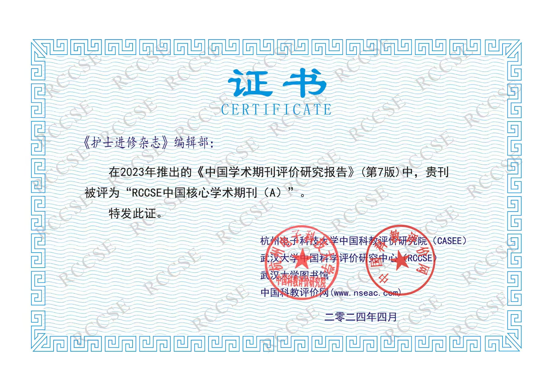 《护士进修杂志》自1986年创刊以来,历获“全国第二届优秀科技期刊三等奖”,中国期刊方阵“双效期刊”,中国生物医学类核心期刊,并被多家数据库收录,在全国护理界享有良好声誉。1992—2008年连续5次作为临床医学类核心期刊入编《中文核心期刊要目总览》。在2024年推出的《中国学术期刊评价研究报告》(第6版)中,《护士进修杂志》被评为“RCCSE中国权威学术期刊(A)”。2002年至今,在中国科学技术信息研究所每年一次的“中国科技期刊引证报告”中,多次被评为“中国统计源核心期刊” ,入选中国科技核心期刊。2025年中国科学院文献情报中心发布的2025—2026年度来源期刊遴选结果,《护士进修杂志》首次入选中国科学引文数据库(CSCD)来源期刊。《护士进修杂志》入选第三十一届北京国际图书博览会(BIBF)“2025中国精品期刊展”。多次荣获“西牛奖·优秀中文科技期刊”。